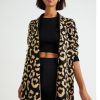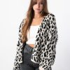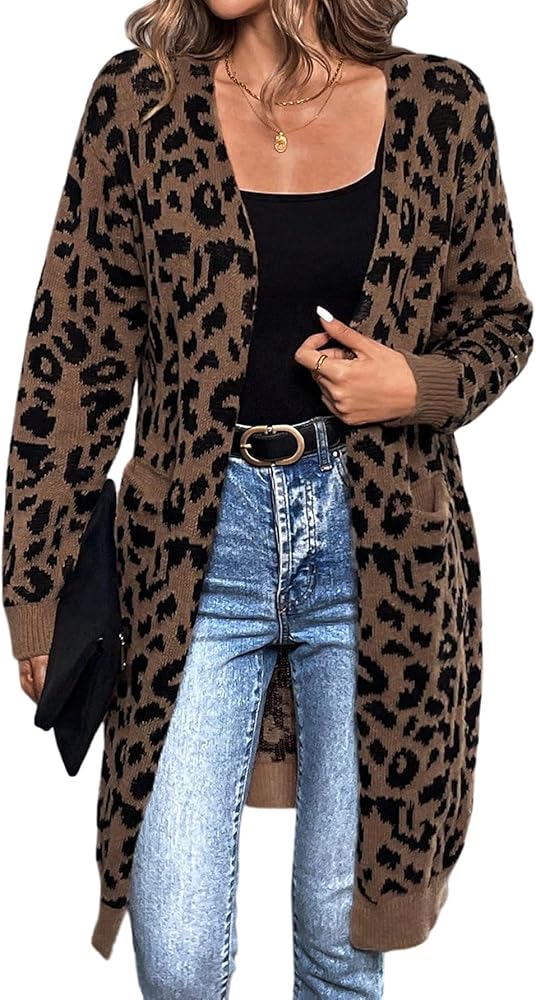 GORGLITTER Strickjacke Damen Lang Winter Leo Jacke Oversize Strickmantel Mit Leo Print Cardigan Mit Taschen Strickpullover Herbst Winter Outfit
