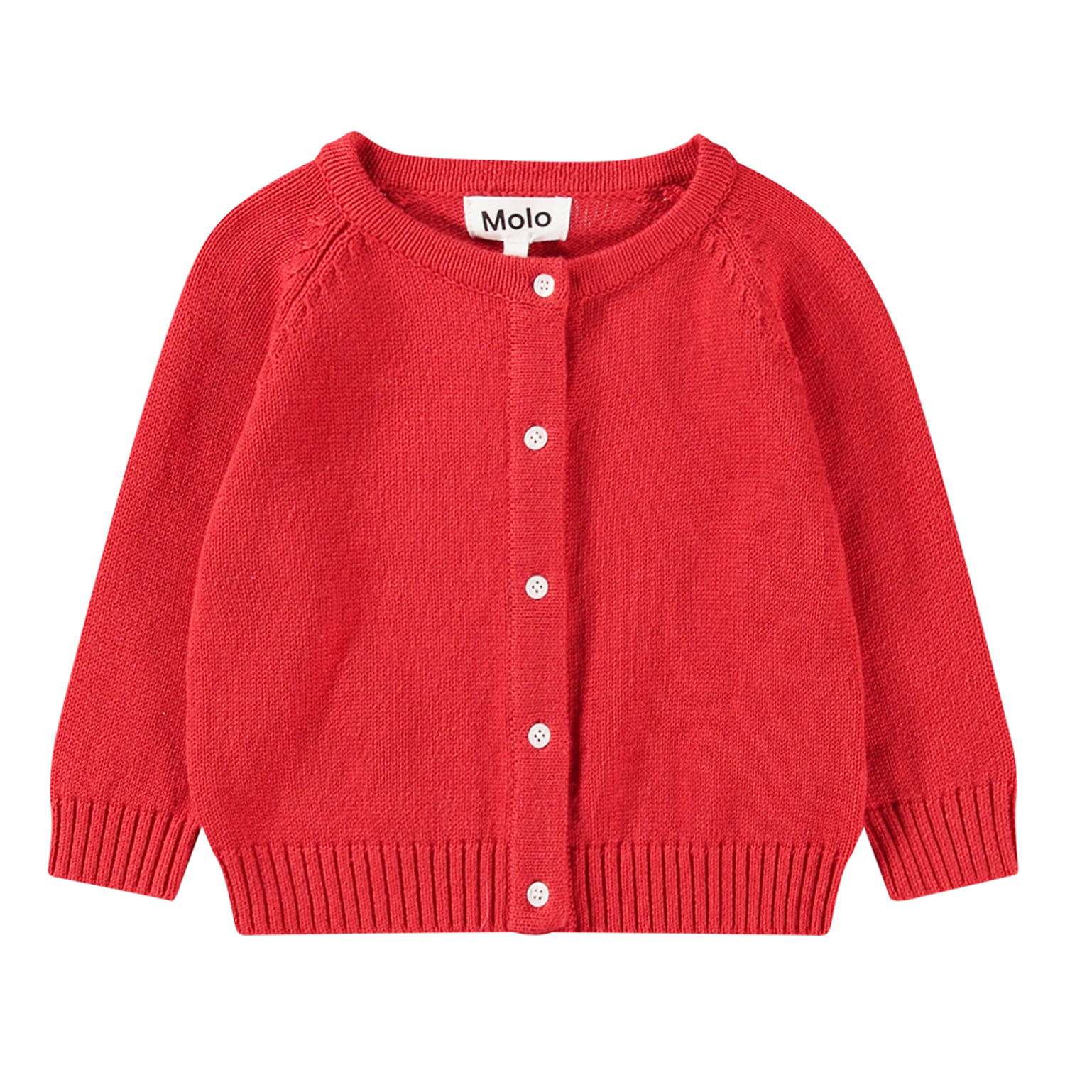 Bobi Adrenaline Rush Roter Baumwoll/Woll Cardigan für Kinder mit geripptem Saum und Knöpfen. Molo